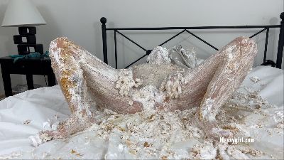 Zoey is nude and chained to a headboard and pied hard in the face. She keeps getting pied and soon a pie slop mound develops on her face. She is then set free so she can smear the pie mess all over her hot body.