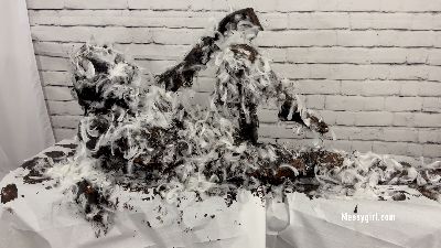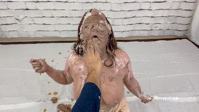 Single mom Sofia received an offer from a customer to go messy extreme and she accepted the challenge. She is handcuffed and has a open ring gag stuffed in her mouth as she takes an onslaught of sweet and savory foods.