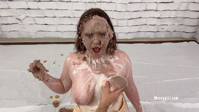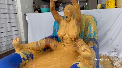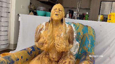 Busty Megan has all kinds of sweet and savory messy foods poured over her. She then has the gross slop mixed poured over her again.