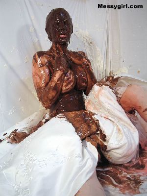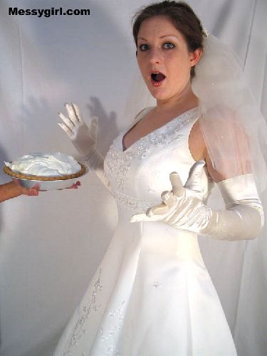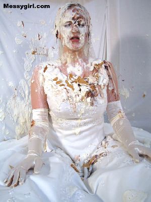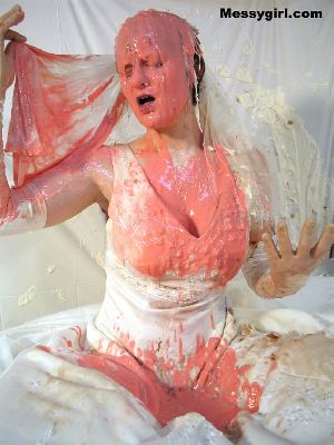 Amber is wearing a wedding dress worth well over $500. It will be worthless after we are done with it! Amber becomes a sloppy mess and the dress is reduced to a large slop rag!