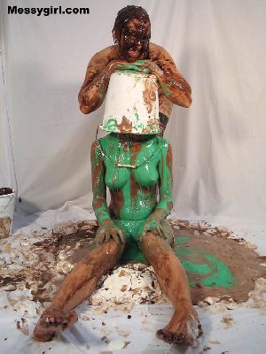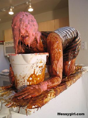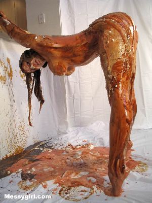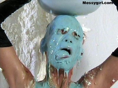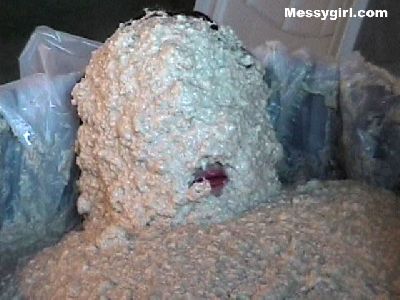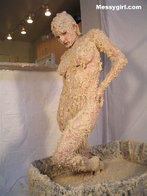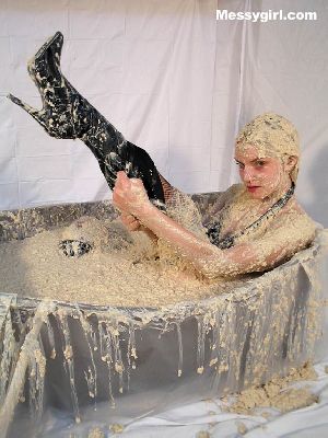Sexy Liz is in her pvc dress, stockings and boots as she takes a bath in 35 gallons of sticky oatmeal. She ends up nude and covered head to toe in the slop!