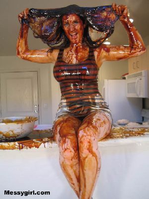 Amber is in her sexy mini dress and heels as she covers herself in molasses, slime and pies! Clothed to nude!