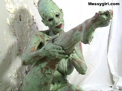 Allison is in her jeans and open blouse as she pies and slimes herself. She takes off the jeans for more messy play!