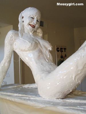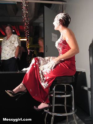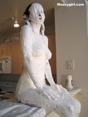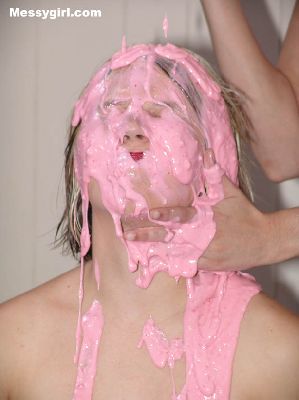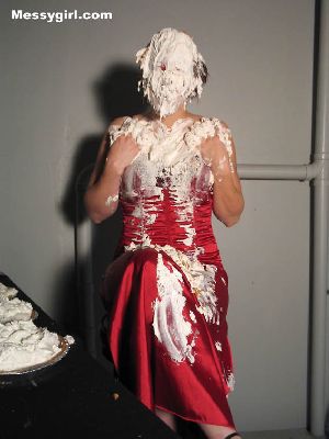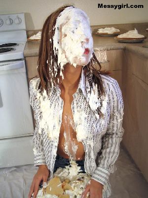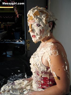 Liz is nude as she is pied with sloppy cream pies all to her face. She rubs the mess all over her sexy body!