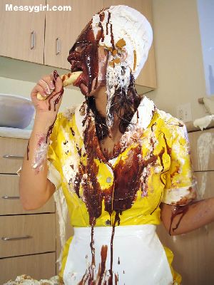 Liz is dressed as a sexy chef and makes a total mess of herself in batter, pies, chocolate and a sheet cake that she sits on!