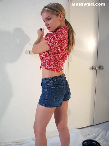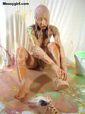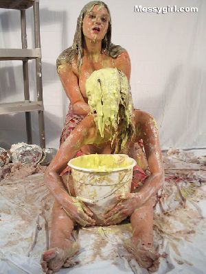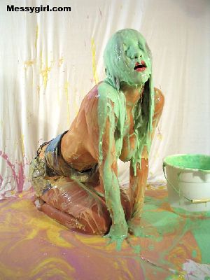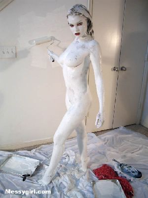 Liz begins to paint a room but decides to paint herself. She is covered in white paint and then tops it off with blue paint and wallpaper paste! Clothed to nude!