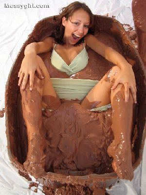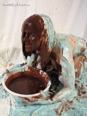 Messygirl is pied and engulfed in chocolate syrup