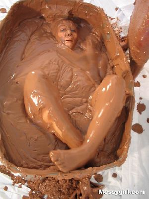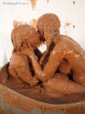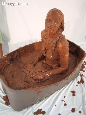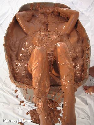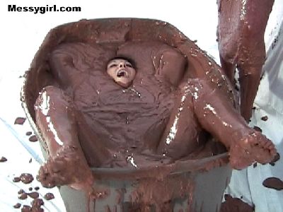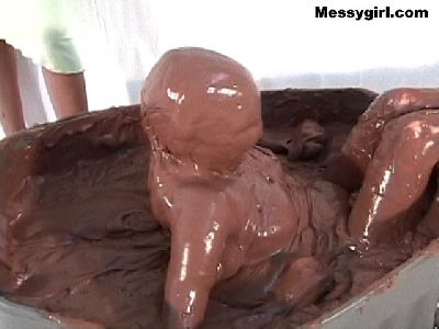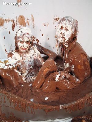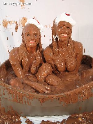 Liz and Lexi are in tight fitting dresses as they step into a tub filled with 40 gallons of chocolate pudding. Both girls go under and come up for air looking like human blobs. The dresses come off and the girls get in together for some tit for tat action and finish off with pies to the face.
