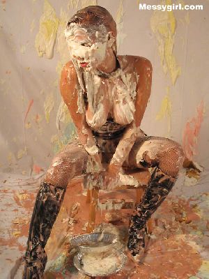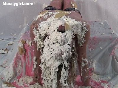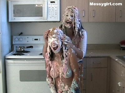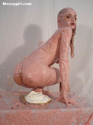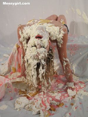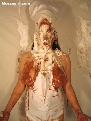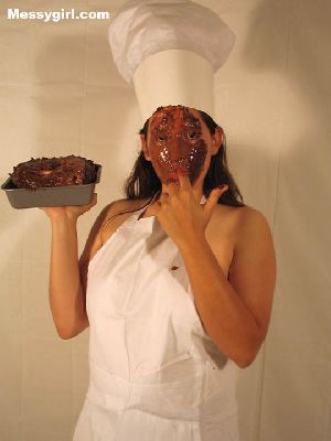 Katie is in only her thong, apron and chefs hat when she whips up her messy recipe of pies, chocolate cake and batter. First she is splattered with the pies and then coated in pink and blue batter. She then eats a chocolate cake with and without her hands, messygirl style! She makes sure to get it all over her face! Katie is a sloppy mess by the time she is done!