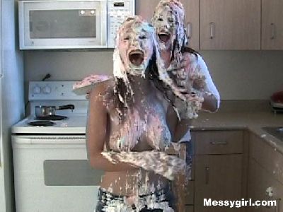 Lexi and Sara go at it again in a messy tit for tat showdown. By the time they are done both girls are topless and covered head to toe in pies, slime and the slop from the floor!