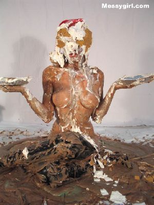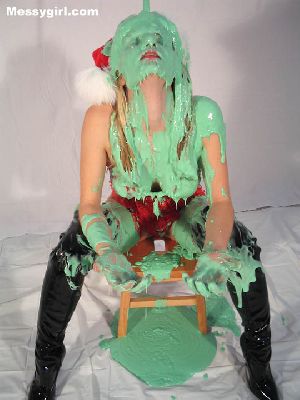 Sexy Liz is in her holiday outfit, a sexy bustier, garters and thigh high boots! She is covered with two large buckets of slime, two large cans of pudding and finishes off herself with a pie sandwich! The only things that stay on after her slopping are her boots and Santa cap!