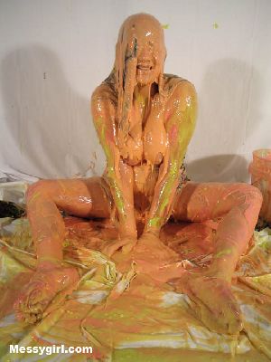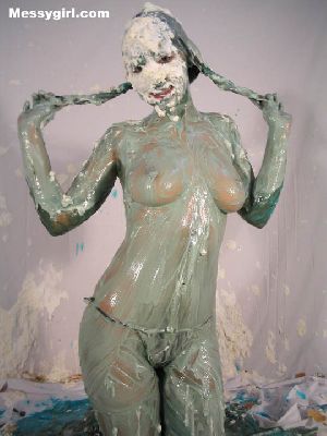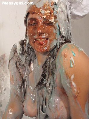 Liz goes from a blouse and sexy mini skirt to nude and messy! She is covered in pies and slime wearing her outfit, but takes it all off for more splattering of pies and slime on her sexy body!