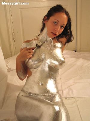 Sexy Lexi covers herself in silver paint wearing only her thong panties. She pulls on a rope for her slime shower to finish the job!