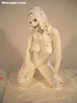 Liz is coated in sticky marshmallow cream wearing her thong bikini and heels. She takes off her bikini to cover her private parts before a gallon chocolate syrup is poured on her!