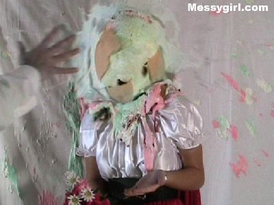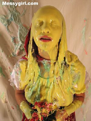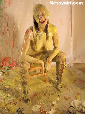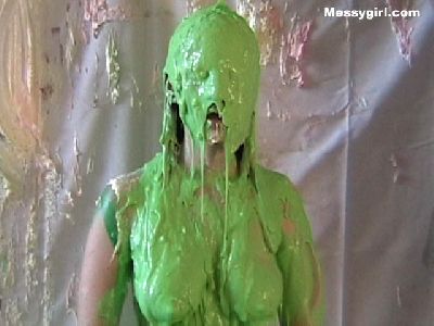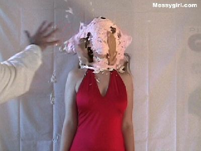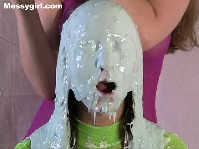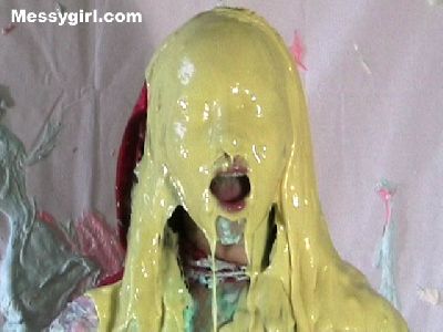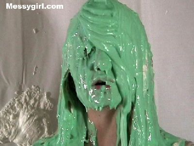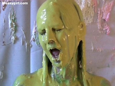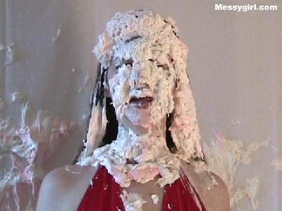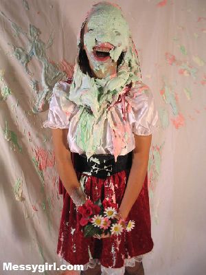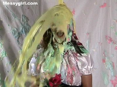 Liz is pied and slimed messygirl style in her very first shoot for us. She starts out in a silk blouse and black skirt and before you know it she is nude and covered head to toe in the slop!