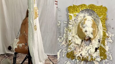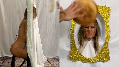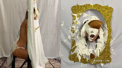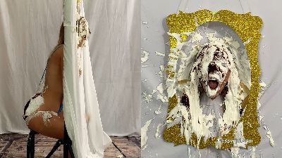 Newbie Stephanie returns and this time she is a human pie target. She is wearing a sexy swimsuit. When she says the magic words "pie me" she gets them all thrown hard at her face. During the pie throws, she takes out her big tits and rubs the cream all over them as the pies continues to obliterate her pretty face. She then pies herself and loves it.