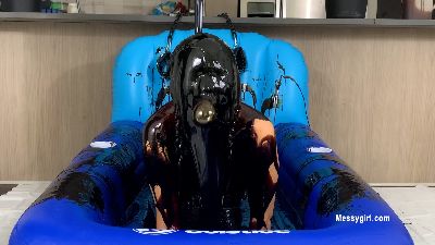 Sexy Zoey is nude and bound as she has 5 gallons of black sticky treacle poured over her.