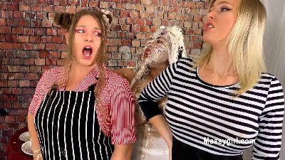 MewMew is not happy with her dessert. So she complains to waitress Brittany. She has enough of MewMew and slams her face into a giant pie and a few regular pies. MewMew demands to see manager Zoey and she too gives it to MewMew. When Zoey and Brittany's backs are turned, MewMew grabs them by the hair and makes them pie each other. Epic stuff!