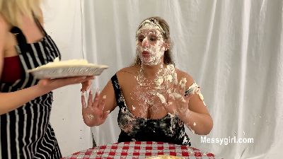 Busty Tatum is not happy with her serving of pie. She tells waitress Zoey to do something about it. Well, Zoey brings out a table full of pies and creams Tatum in the face and face plants her into a huge pie. Tatum then returns the favor on Zoey. Hot stuff!