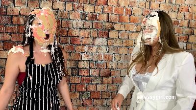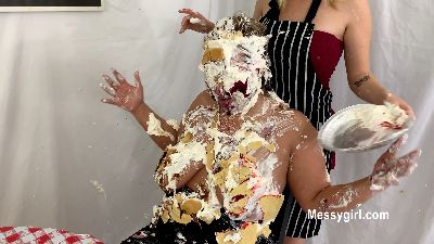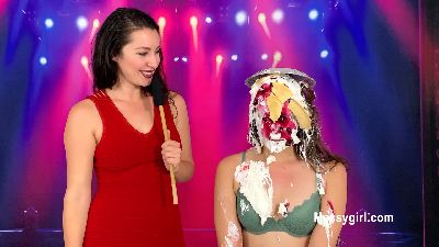 Zoey talks Penelope into joining her at her new job at the pie booth. Both girls are in thong bikinis and have their hands tied behind their backs as they take on an endless barrage of thrown pies to the face.