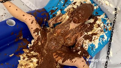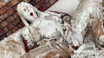 Tilly is captured in the stairwell and taken to a secluded room. She is stripped down, hooded, gagged and tied to a chair. She is then covered in pies and pudding. She is even force-feed bags of whipped cream. Hot stuff!