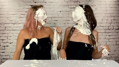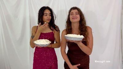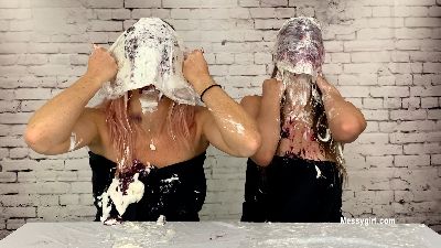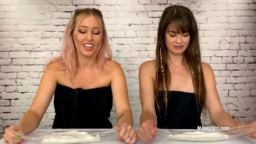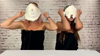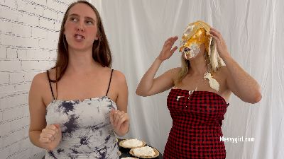 Zoey and Tori smear plastic wrap sheets filled with whipped cream and pie filling on their faces.