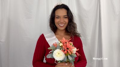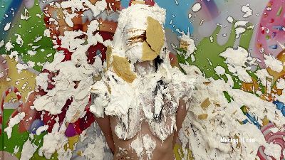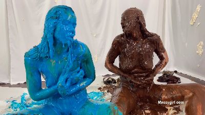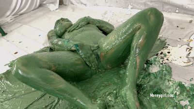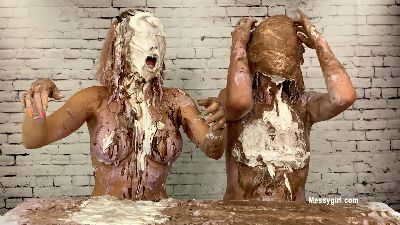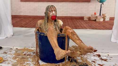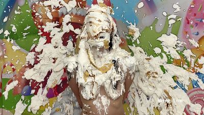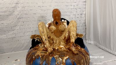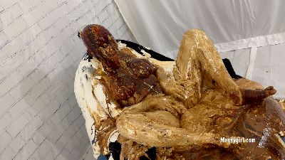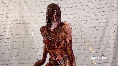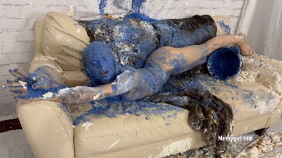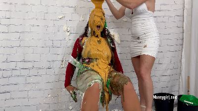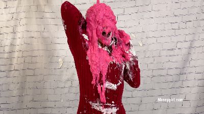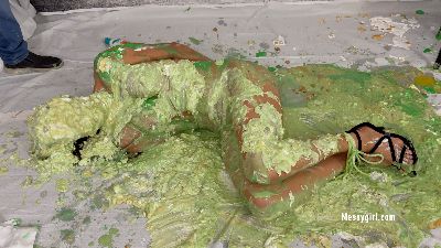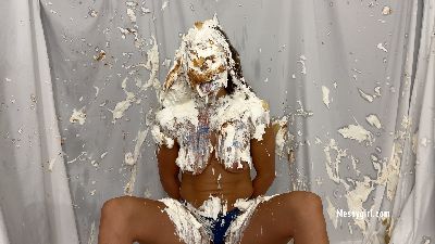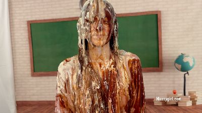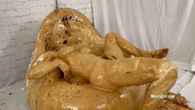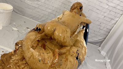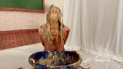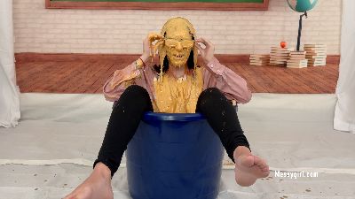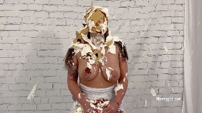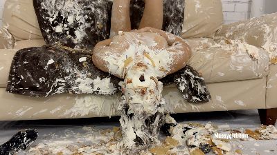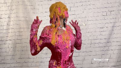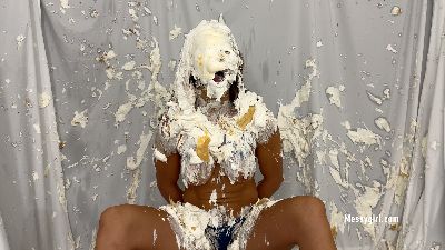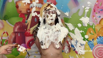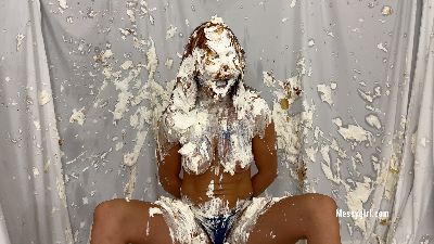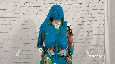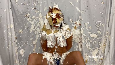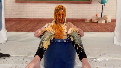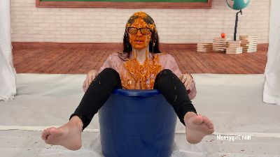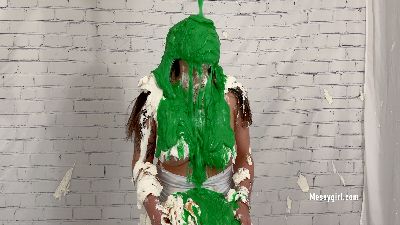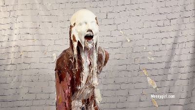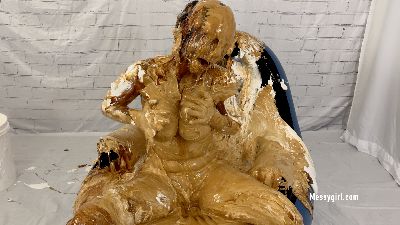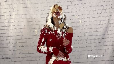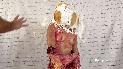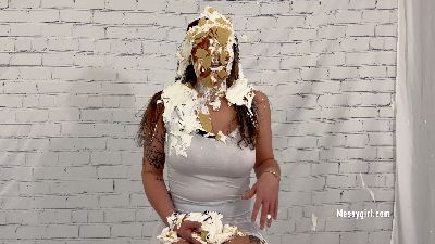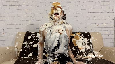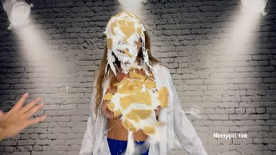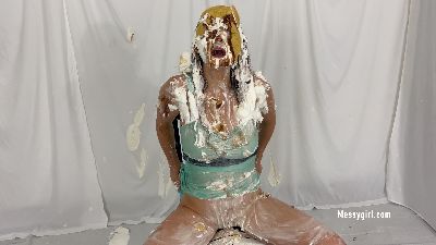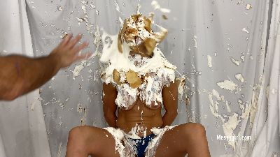 Santana is destroyed with pies and slime as she sits on the Messygirl casting couch. Total head to toe coverage for her.