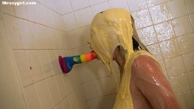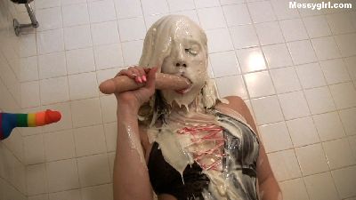 Amy has never been naughtier. She uses two dildos on herself, as she is covered in cream and custard. She takes both of them deep in her throat and in her pussy. Very hot!