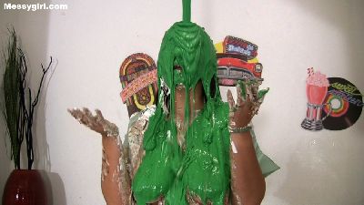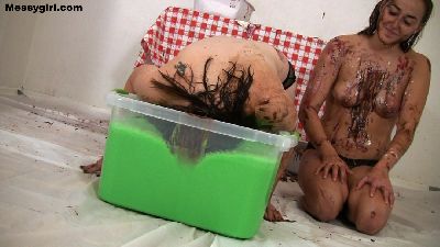 Leila returns and this time she brings along her friend Melissa. We thought it would be fun to introduce them to our first edition of the Messygirl games. The girls will need to compete against each other in a series of messy games. This version will have a pie eating contest, chocolate banana dunking and bobbing for apples in slime. We added the extra twist of having the winner humiliate the loser of each game.