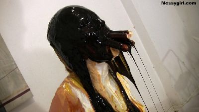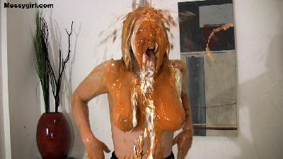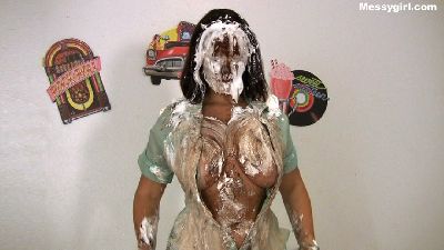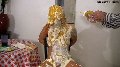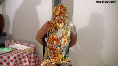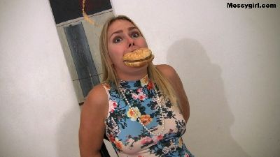 Vika is a bitching customer. She doesn't like her hamburger and lets the manager know about it. When the manager has had enough of her bitching, he shuts her up by stuffing the burger in her mouth. Next comes a savoy onslaught of sour cream, mustard, ketchup, ranch and 1000 island dressings. Poor Vika is a total mess, but the manager is just getting started. Vika is now nude, and her mouth is stuffed with hot dog wieners. She then has cold sour cream rubbed all over her face and tits. This is followed with more mustard. ketchup and salad dressing. Just when she thinks it`s over, out comes the treacle. Vika's head and face are engulfed in the dark sticky stuff. You will get a kick from the gargling sound Vika makes as she breaths with the mess over her face and wieners in her mouth.