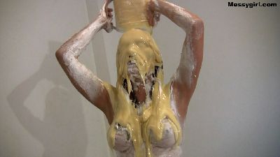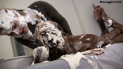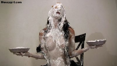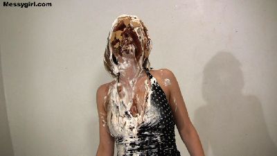 Justine has been baking all day and needs to decompress, and what better way to do so, than to get head to toe messy. Justine starts with pies to the face, and then takes off her dress and pulls down her panties to sit on a pie. She then pours four buckets of batter over her head. That is followed with a sexy nude wallowing in the mess.