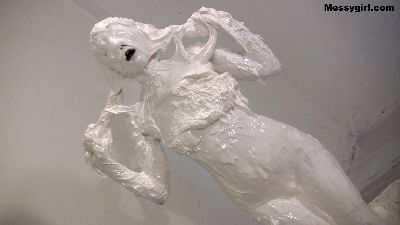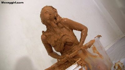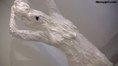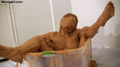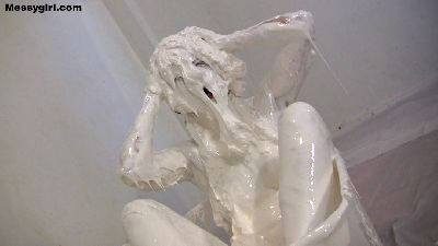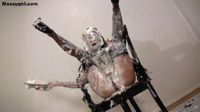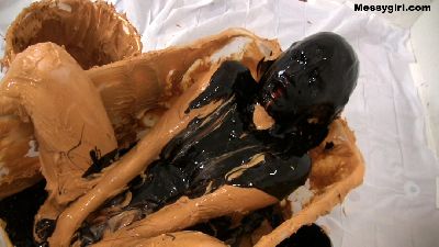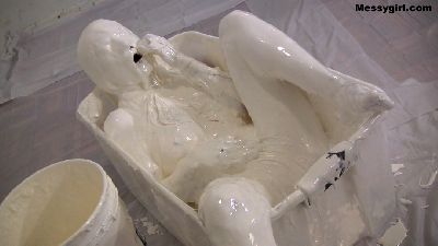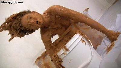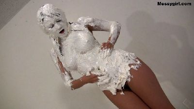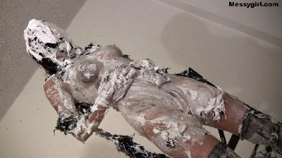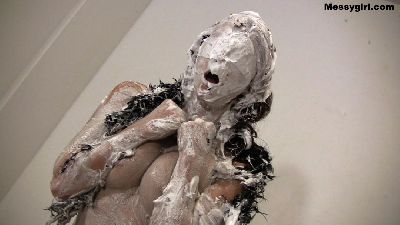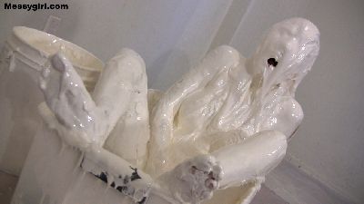Penelope starts out nude and goes head first in the 5 gallon bucket of sticky fluff. She then starts to coat her sexy body and face until she is an unrecognizable blob. Once covered, she masturbates until she cums.