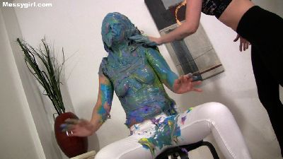 Deni starts out wearing white jeans and a white top. She is pied first and then takes a bucket of hot pink slime over hear head. She is ordered to take off her top and gets more slime. Once totally covered, she takes off her jeans and pulls down her panties for a pie to the ass and gets a wedgie. Deni then goes nude for more pies and a chocolate sliming. Finally she is instructed by Vika to play in the mess on the floor.