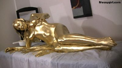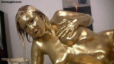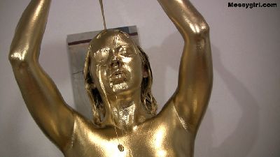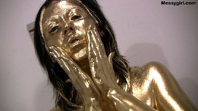 XlcrMoon returns and this time it's to be painted gold. She starts out nude a proudly shows off her body art. She starts by painting her feet, and then slowly moves her hand up the rest of her hot body. After she is done, her body art tats are gone, and all you see is her sexy golden figure.
