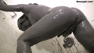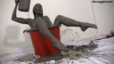 Lane is in overalls as she covers herself head to toe in slippery mud from a huge tub. She even takes a dip in it both clothed and nude.