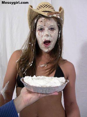 Mistress Liz breaks in a new messygirl. WAM virgin Amy gets a nice dosage of pies and batter while in the stocks. Total coverage!
