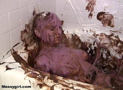 Vicky is in her white satin pajamas as she gets the messygirl treatment. Total coverage!