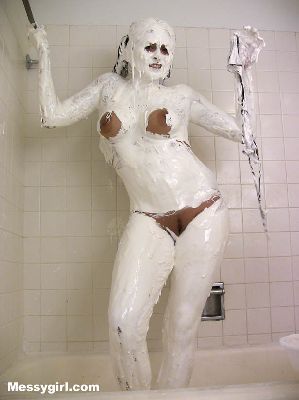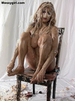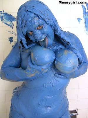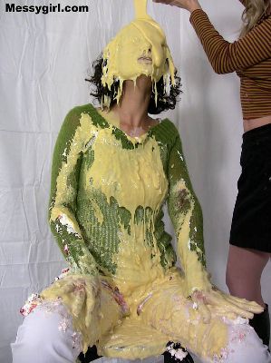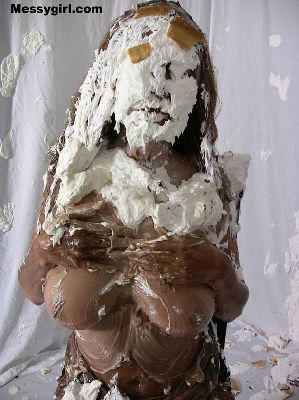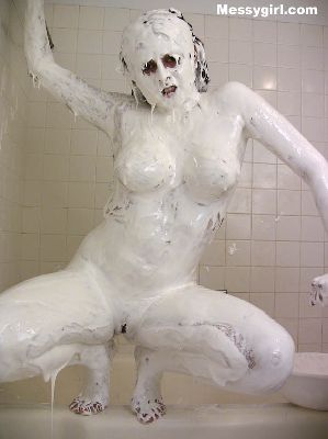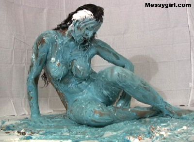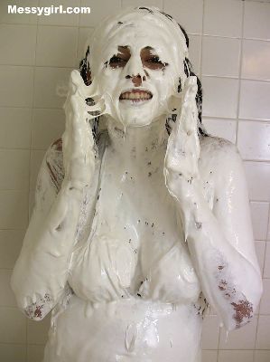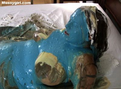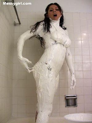 Busty Vicky is in a red body stocking as she gets the messygirl treatment. She ends up nude and totally covered.
