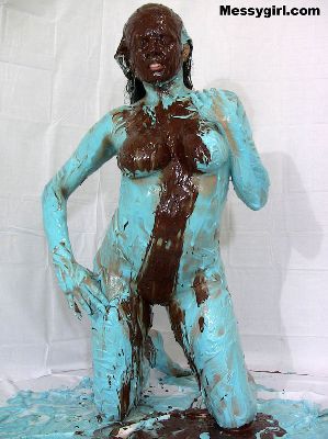 Busty Vicky covers herself head to toe in blue butter cream icing and tops it off with chocolate syrup.