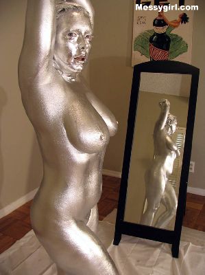 Sexy Mila is covered head to toe in silver paint!